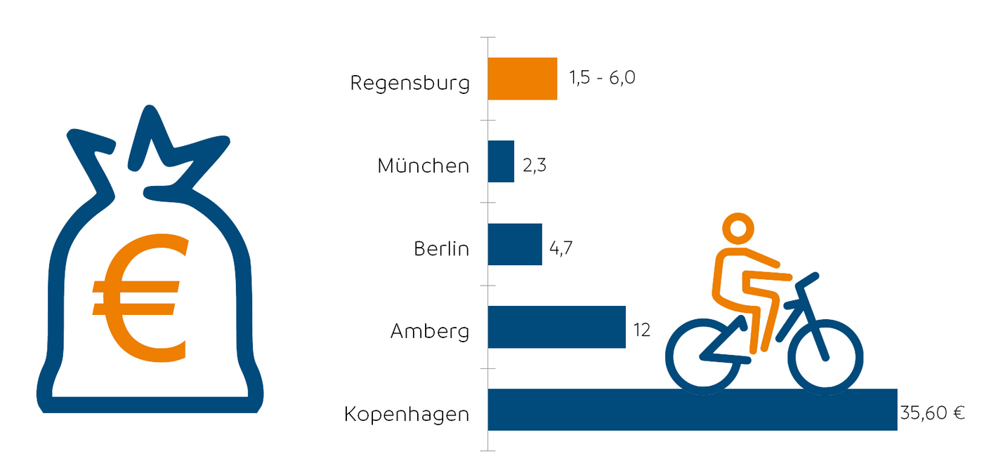 Ausgaben für den Radverkehr in € pro Einwohner und Jahr Quelle: Greenpeace, 2018 - eigene Berechnung für Amberg, Regensburg © ADFC Regensburg